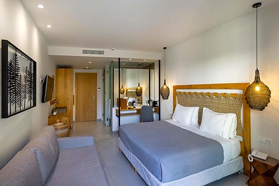 Located on the second floor, this spacious, bohemian-styled and 3-level suite of 40 m2 offers a 12-m2 infinity pool. It has: -private balcony with side sea view -a king size bed -2 sofa beds in the living room -stylish bathroom with shower cabin and bathtub Maximum occupancy is 2-4 people.